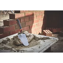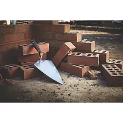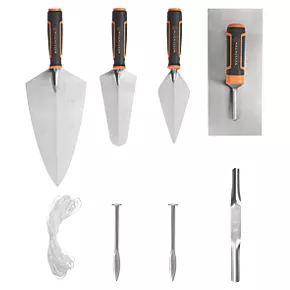 Set consisting of brick, plastering, gauging and pointing trowels alongside 2 line pins with brick line. Features a soft-grip handle, heat-treated carbon steel blades and finger guard protection.